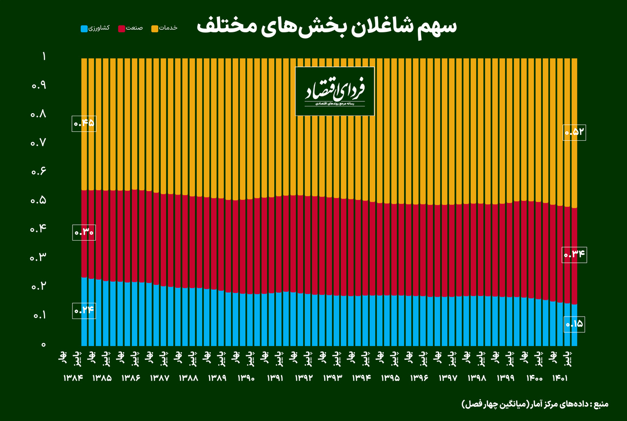 وضعیت اشتغال بخشهای مختلف نیز نشان میدهد که سهم شاغلان بخش خدمات افزایش، بخش صنعت ثابت و سهم بخش کشاورزی کاهش یافته است. در واقع به نظر میرسد که بیشتر مشاغل جدیدی که ایجاد شدهاند از نوع بنگاههای کوچک و خرد در بخش خدمات بوده باشند که در دوره کرونا تا حدود زیادی از بین رفتند. از طرف دیگر کاهش اشتغال در بخش کشاورزی نیز با توجه به رشد اقتصادی این بخش و مشکلات کمآبی، طبیعی به نظر میرسد. بخش صنعت نیز با توجه به رشد این بخش طی یکسال گذشته، توانسته با افزایش محدود در اشتغال، سهم خود را تا حدود زیادی حفظ کند.