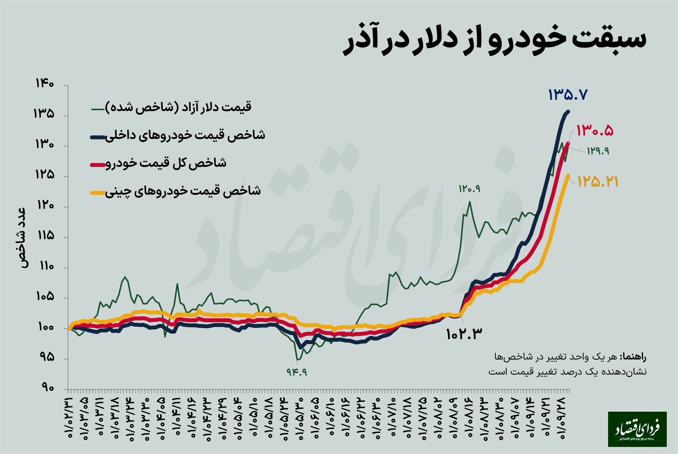 رشد ۱۱.۷ درصدی نرخ ارز در آذر موتور محرک صعود خودرو بود. اگرچه خودرو در آذر بیشتر از دلار رشد کرده است، اما در مقیاس از ابتدای سال، هنوز از دلار عقب است. در نه ماهه نخست سال جاری دلار و سکه ۵۰ درصد گران شدهاند. این در حالی است که قیمت خودرو از ابتدای سال ۴۳.۵ درصد افزایش داشته است. میتوان این رشد کمتر را به انتظار نسبت به واردات خودرو و همچنین کوتاه شدن دست دلالان از این بازار با عرضه خودرو در بورس مرتبط دانست.