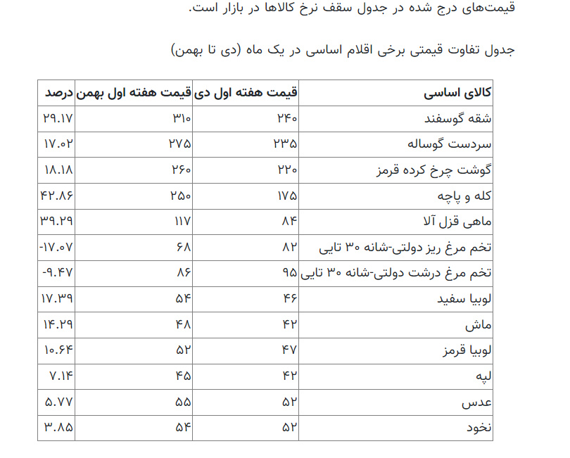سقف قیمتی مرغ از ۵۲.۵۰۰ تومان در ابتدای دی ۱۴۰۱ به ۵۵ هزار تومان در ابتدای بهمن رسیده است. شقه گوسفندی از حداکثر کیلویی ۲۴۰ هزار تومان با افزایش ۲۹.۱۷ درصدی به ۳۱۰ هزار تومان در ابتدای بهمن رسیده است. این در حالی است که وزارت جهاد کشاورزی با راه اندازی سامانه ستکاوا مدیریت یکپارچه و تنظیم بازار گوشت قرمز را همچون بازار مرغ در دستور کار دارد.