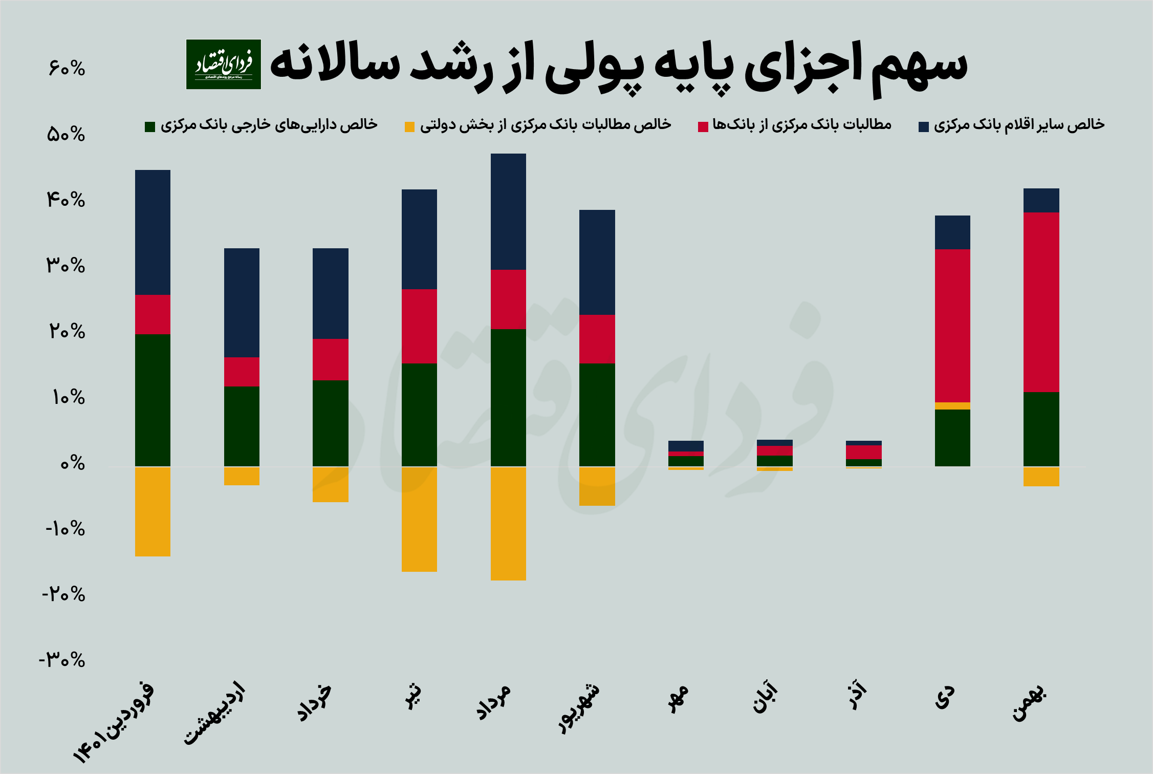 یکی از ادعاهای معمول دولت و بانک مرکزی این است که دولت کسری بودجهاش را از طریق بانک مرکزی تأمین نکرده است. با این حال، اولاً مشخص نیست کسری بودجه عظیمی که تخمین زده میشود و منظور از اندازه حداقل ۳۰۰ هزار میلیارد تومانی آن، کسری بودجه واقعی به جز اوراق منتشرشده است، از چه راه جایگزینی تأمین شده است. همزمان رشد پایه پولی هم تا بهمن روندی صعودی را طی کرده است.