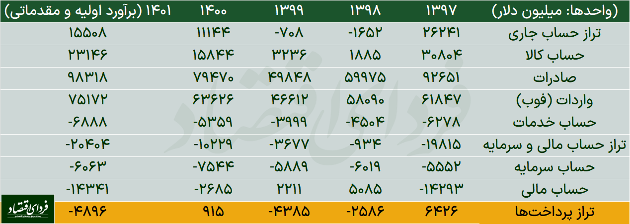 تراز پرداختها از مجموع تراز حساب تجاری و تراز حساب مالی و سرمایه به دست میآید و هر چند تراز تجاری در دو سال گذشته مثبت بوده، با این حال منفی شدن حساب مالی و سرمایه به مقدار بیش از ۲۰ میلیارد دلار در سال ۱۴۰۱ باعث کاهش این چنینی در تراز پرداختها شده است. جدول زیر جزئیات تراز پرداختها را از ۱۳۹۷ نمایش میدهد.