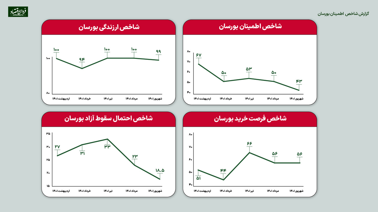 طبق استاندارد نظرسنجی شیلر در دانشگاه ییل، ۱۵ مدیر از ۸۱ نفر احتمال ریزش سنگینی مشابه دی ماه ۹۲ یا مرداد ۹۹ را در ۶ ماه آینده بیش از ۱۰ درصد میدانند. همچنین هیچ یک از مدیران دارایی شرکتکننده در این نظرسنجی، احتمال ریزش سنگین بورس را بیش از ۳۰ درصد اعلام نکردهاند؛ در مردادماه ۶ نفر از مدیران دارایی احتمال چنین سقوطی را مطرح کرده بودند. بنابراین، «شاخص احتمال سقوط آزاد» بورسان (Crash Index) عدد ۱۸.۵ را نشان میدهد. در نظرسنجی پیشین، ۲۳ درصد شرکتکنندگان احتمال ریزش سنگین بورس را بیش از ۱۰ درصد دانسته بودند. هرچه این عدد به صفر نزدیکتر باشد، یعنی شانس مواجهه بورس با یک ریزش چشمگیر پایینتر است و عدد ۱۰۰ بیانگر بالاترین شانس سقوط آزاد قیمتها خواهد بود.