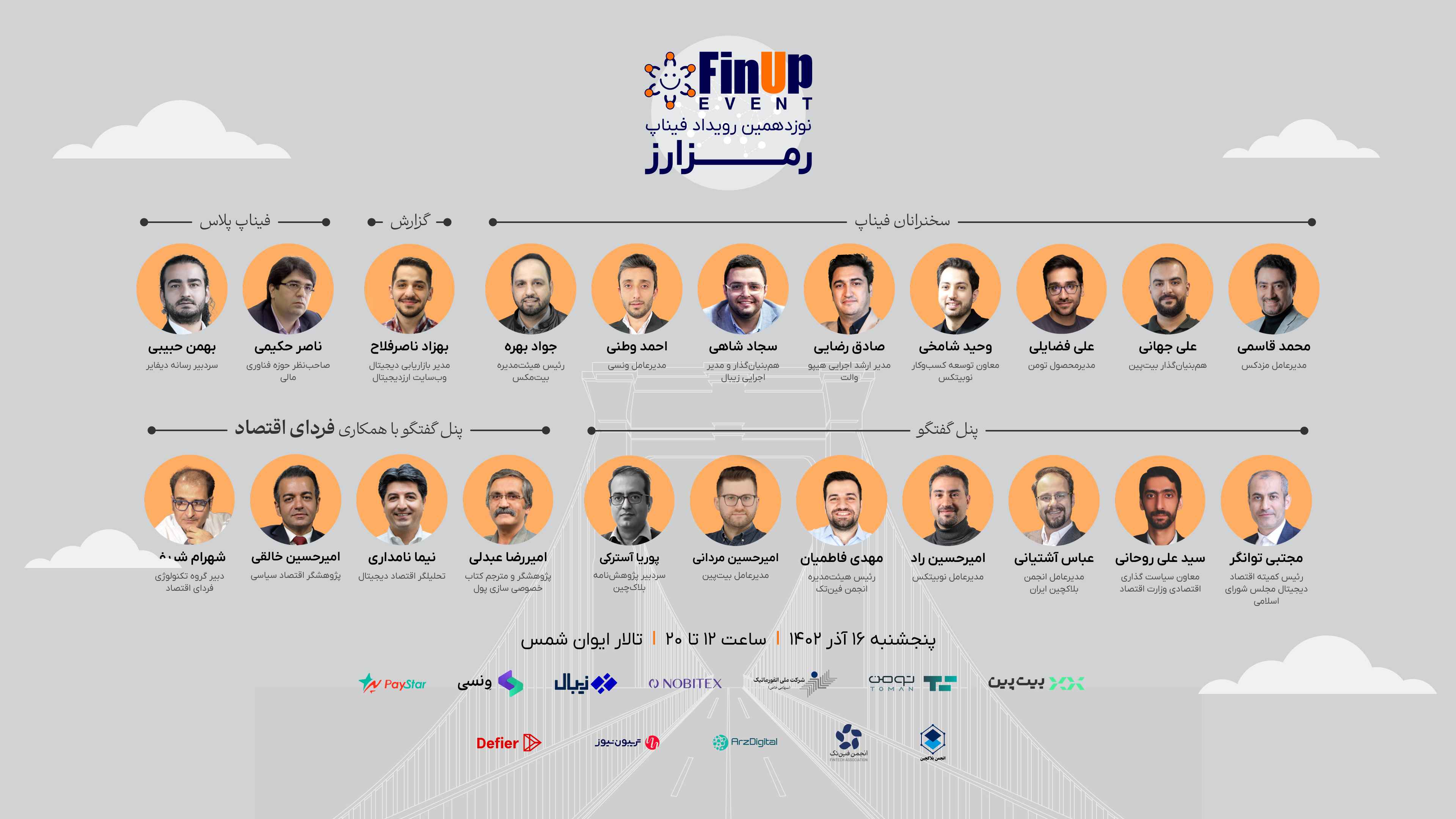 در رویداد فیناپ رمزارز وحید شامخی «معاون توسعه کسبوکار نوبیتکس» صادق رضایی «مدیر ارشد اجرایی هیپو والت» سجاد شاهی «همبنیانگذار و مدیر اجرایی زیبال» احمد وطنی «مدیرعامل ونسی» جواد بهره «رئیس هیئتمدیره بیتمکس» محمد قاسمی «مدیرعامل مزدکس» علی جهانی «همبنیانگذار و رئیس هیئتمدیره بیتپین» علی فضایلی «مدیرمحصول تومن» ارائههای تخصصی با موضوعاتی جدید و جذاب خواهند داشت.