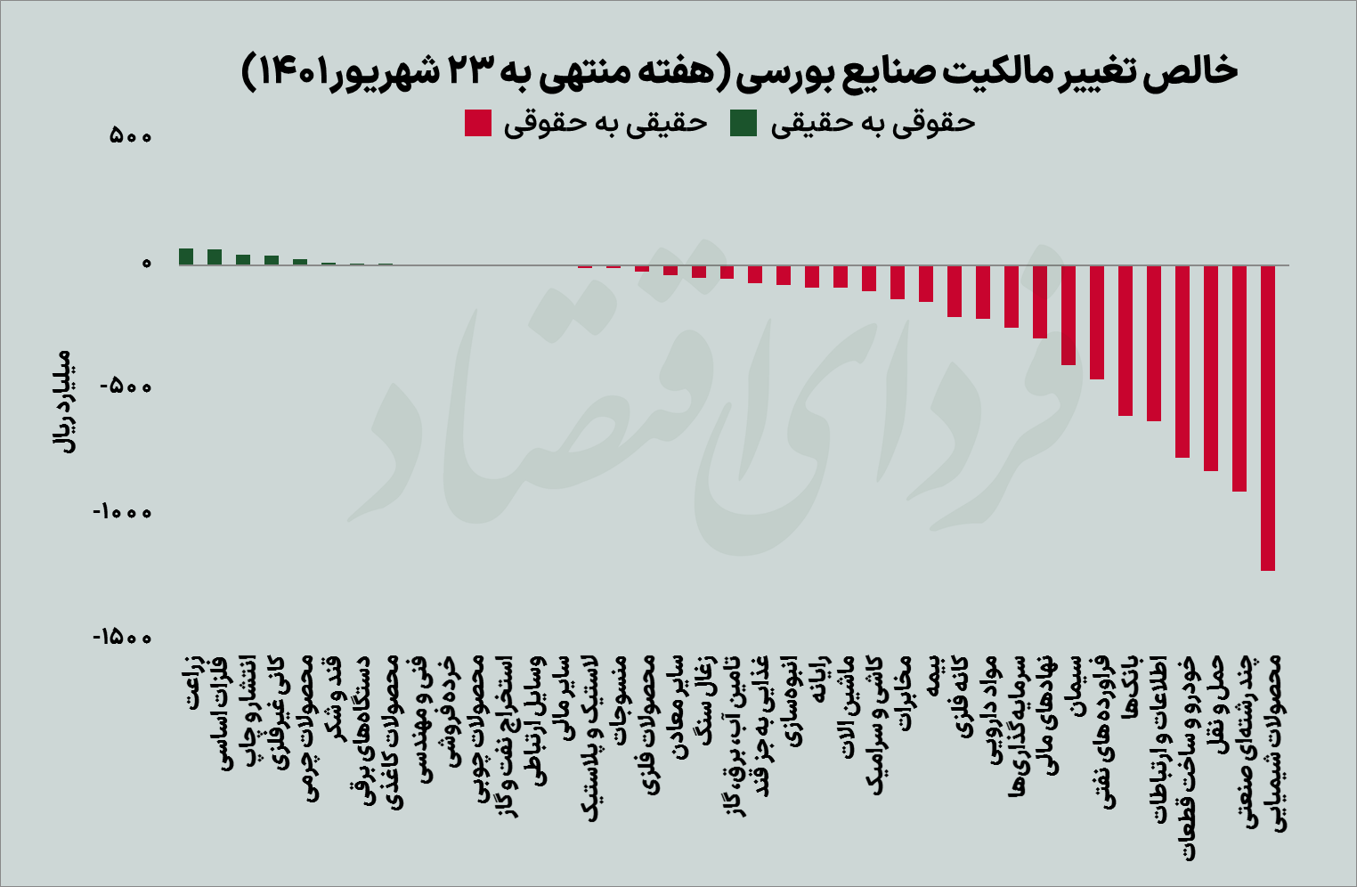 اما از متغیرهای اثرگذار بر حال و هوای این روزهای بورس تهران که بگذریم، همانطور که اشاره شد در هفته کاری منتهی به ۲۳ شهریورماه، شاخص کل بورس تهران با ثبت افت ۱.۷ درصدی برای چهارمین هفته پیاپی تن به نزول داد و تا محدوده یک میلیون و ۳۸۹ هزار واحدی عقب نشست. حقیقیها نیز دست از فروش برنداشتند و در مجموع دادوستدهای هفتگی خود، مالکیت سهامی به ارزش ۱۰۳۱ میلیارد تومان را به سهامداران عمده بازار سهام واگذاری کردند. در این میان نگاهی به عملکرد هفتگی بازیگران بورسی در صنایع فعال نشان از ورود سرمایههای خرد به ۸ صنعت در مقابل خروج از ۲۹ گروه دارد. در صدر لیست ورودی زراعیها قرار داشتند که شاهد جابهجایی سهامی به ارزش بیش از ۶.۵ میلیارد تومان در مسیر حقوقی به حقیقی بودند. پس از آن نوبت به گروه فلزات اساسی رسید تا با محوریت «فولاد»، خالص خرید بیش از ۶.۲ میلیارد تومانی حقیقیها را ثبت کنند. در آنسوی بازار پتروشیمیها با بیشترین خروج سرمایه خرد به میزان افزون بر ۱۲۰ میلیارد تومان مواجه شدند و شرکتهای چندرشتهای صنعتی نیز در روندی مشابه، انتقال سهامی به ارزش ۹۰ میلیارد تومان را در مسیر حقیقی به حقوقی تجربه کردند.