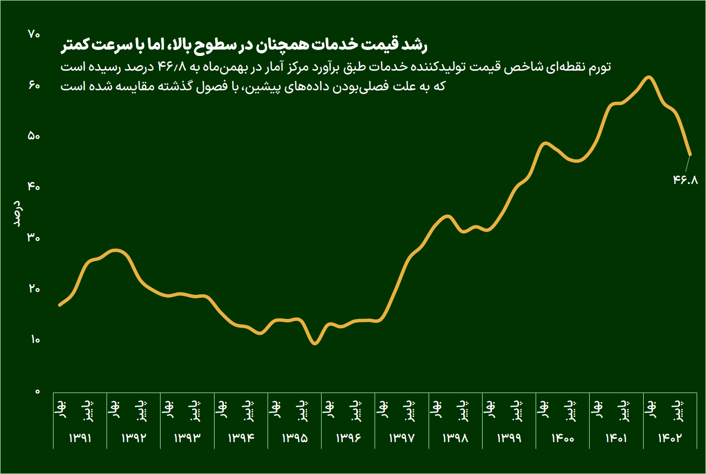 به طور میانگین و بر اساس وزن هر کدام از فعالیت‌ها در کل ارزش افزوده ایجادشده در بخش خدمات، ۴۶٫۸ درصد تورم تولیدکننده در بخش خدمات تا بهمن‌ماه رخ داده که پایین‌تر از میانگین این نرخ در فصل‌های گذشته است.