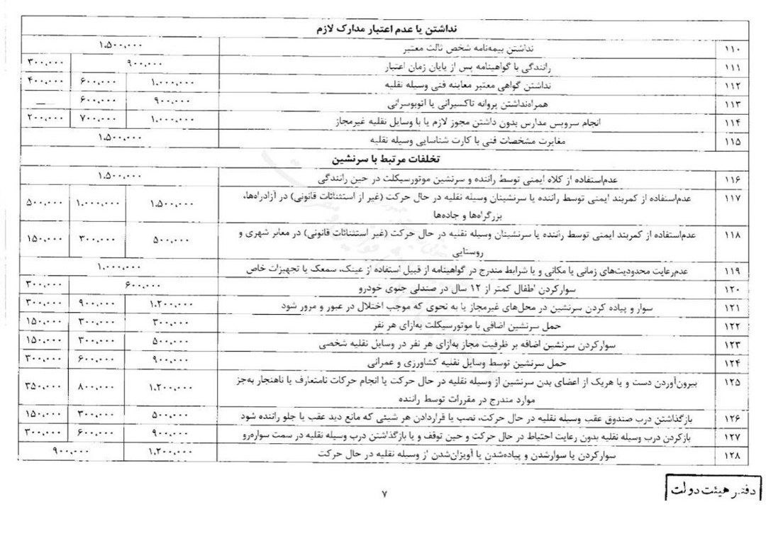 بر اساس این مصوبه، جریمه نداشتن بیمه شخص ثالث معتبر ۱۵۰ هزار تومان تعیین شده است.