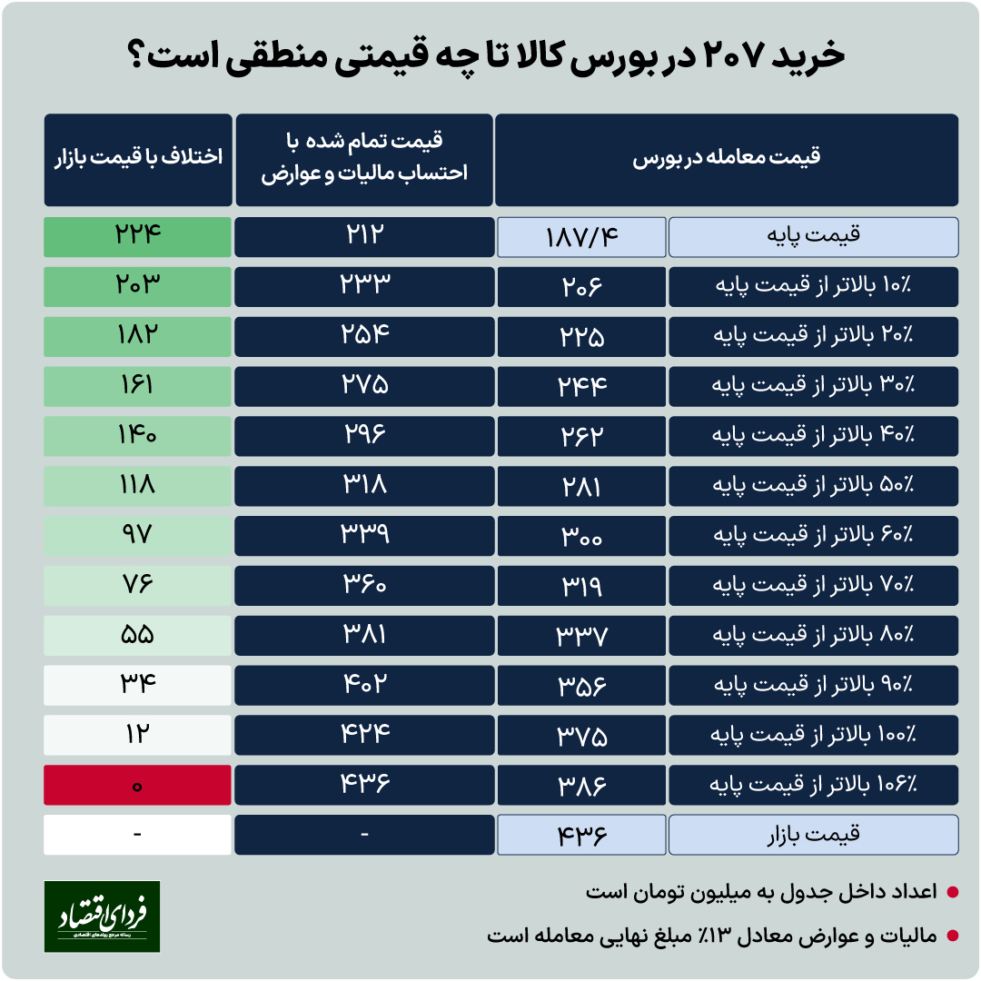 با توجه به آنکه قیمت ۲۰۷ در بازار ۴۳۶ میلیون تومان است، حداکثر قیمتی که برای ثبت سفارش منطقی است ۳۸۶ میلیون تومان خواهد بود. به عبارت دیگر، اگر افراد به قیمت ۳۸۶ میلیون تومان سفارش بگذارند، قیمت تمام شده برابر با همان ۴۳۶ میلیون تومان خواهد بود.