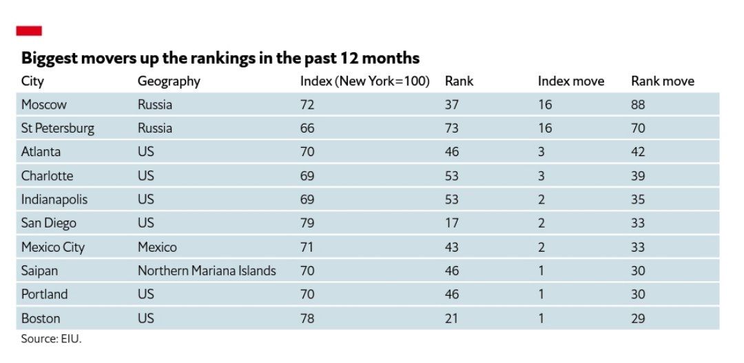 بزرگترین حرکتهای صعودی، شهرهای مسکو و سنت پترزبورگ روسیه هستند که به ترتیب با ۸۸ و ۷۰ پله صعود در رتبهبندی قرار گرفتهاند. قیمتهای محلی در روسیه به دلیل تحریمهای غرب افزایش یافته است. طبق بررسی اکونومیست از قیمتها، تورم نقطهای در مسکو اکنون ۱۷.۱ درصد است، در حالی که در سنت پترزبورگ به این میزان به ۱۹.۴ رسیده است.