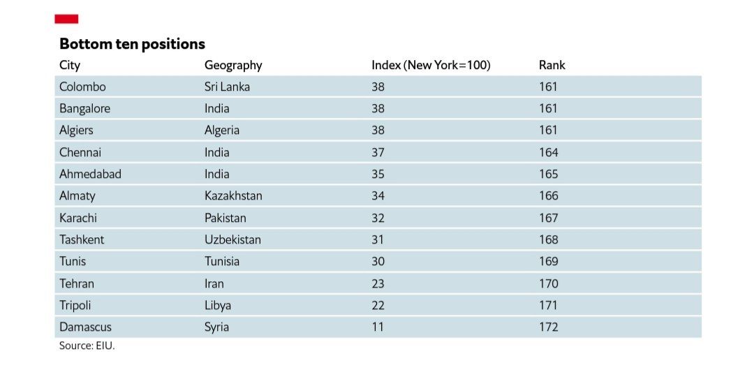 ارزانترین شهرها در رتبهبندی اکونومیست دمشق، طرابلس و تهران هستند که نشان دهنده اقتصاد و ارز ضعیف این کشورها است. دمشق و طرابلس اغلب در انتهای رتبهبندی هزینه زندگی قرار دارند. در محاسبه شاخص تهران در سال جاری، اکونومیست تصمیم گرفته است به جای نرخ ارز رسمی ۴۲۰۰ تومانی، از نرخ ارز واقعیتر بازار آزاد استفاده کند. در نتیجه، تهران اکنون سومین شهر ارزانقیمت در رتبهبندی مقایسهای اکونومیست است، در حالی که سال گذشته رتبه بسیار بالاتری داشت. این اتفاق قدرت ضعیف و افت جدی اقتصاد ایران را نشان میدهد.