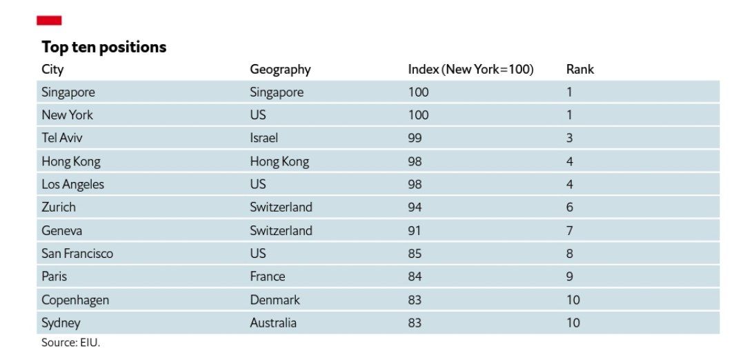 عوامل ساختاری مانند رقابت یا تقاضای بالا نیز نقش کلیدی در تعیین هزینه زندگی دارند. از آنجایی که برای محاسبه شاخص هر شهر، قیمتهای ارز محلی به دلار آمریکا تبدیل میشود، رتبهبندی اکونومیست نیز بر اساس نرخ مبادله در برابر دلار است. امسال با افزایش نرخ بهره توسط فدرال رزرو (فدرال رزرو، بانک مرکزی ایالات متحده) شاهد تقویت دلار در برابر بسیاری از ارزها بودیم. ترکیب این دو عامل، یعنی درآمد بالا و نرخ ارز قویتر، سنگاپور و نیویورک را به صدر رتبهبندی شاخص هزینه زندگی در سال ۲۰۲۲ رسانده است و آنها را به گرانترین شهرهای جهان تبدیل کرده است. ارز قویتر و نرخ تورم بالاتر به این دو شهر این امکان را داده است تا تلآویو را که در رتبهبندی سال گذشته در رتبه اول قرار داشت، به رتبه سوم برسانند.
