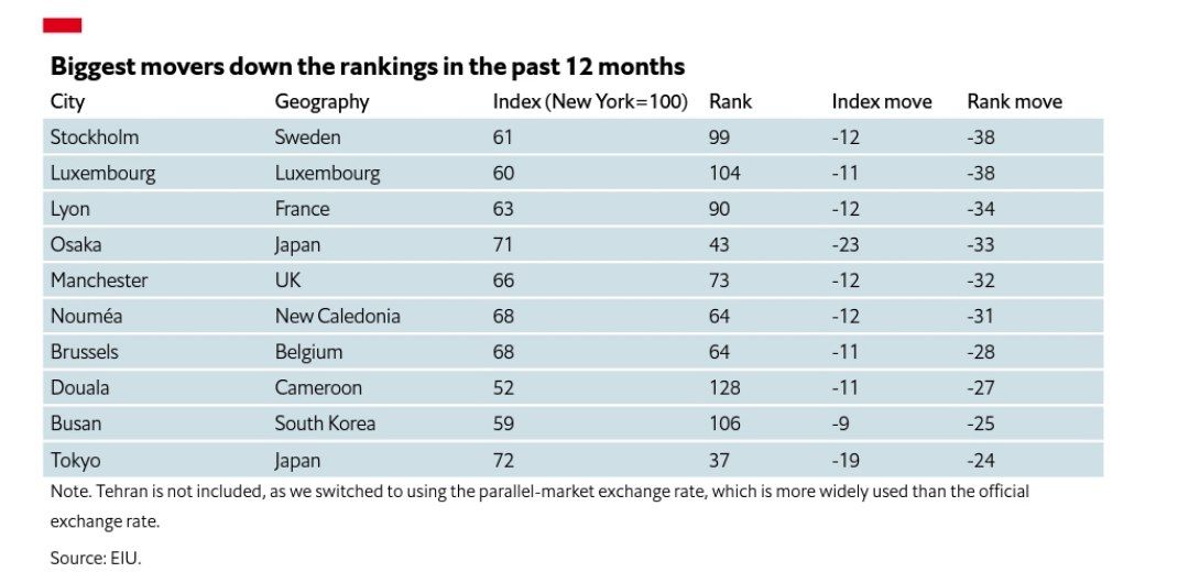 از میان ده کشوری که بیشترین افت را در رتبهبندی اکونومیست دارند، شهرهای اروپایی مانند لوکزامبورگ و استکهلم پنج شهر را به خود اختصاص دادهاند. در حالی که تورم در اروپا افزایش یافته است، بحران انرژی که به دنبال تهاجم روسیه به اوکراین رخ داده، قاره را وارد رکود و کاهش ارزش پول در برابر دلار آمریکا کرده و در نتیجه شاخصهای هزینه زندگی را برای برخی از شهرهای اروپایی کاهش میدهد. در اواخر ماه آگوست نرخ برابری یورو به دلار برای اولین بار در ۲۰ سال گذشته به کمتر از عدد یک سقوط کرد. ژاپن و کره جنوبی نیز شاهد کاهش ارزش پول بودهاند، در حالی که تورم ارز محلی در این کشورها نسبتاً کم شده است. این باعث کاهش شاخصهای هزینه زندگی توکیو و سئول در مقایسه با نیویورک شده است.