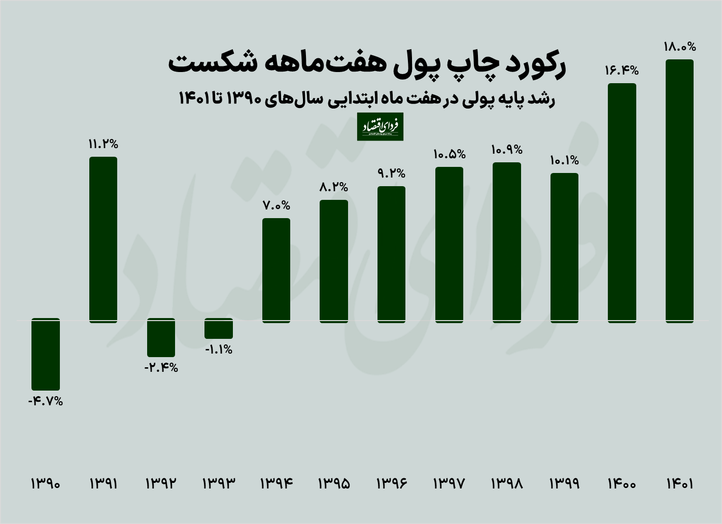 در ۷ ماهه سال جاری پایه پولی حدود ۱۱۰ هزار میلیارد تومان افزایش یافته است که معادل ۱۸ درصد رشد پایه پولی طی ۷ ماه است. افزایش ۱۸ درصدی پایه پولی طی ۷ ماه ابتدایی سال طی دو دهه گذشته بیسابقه بوده است. در نمودار زیر میزان رشد ۷ ماهه پایه پولی از ابتدای دهه ۹۰ نشان داده شده است.